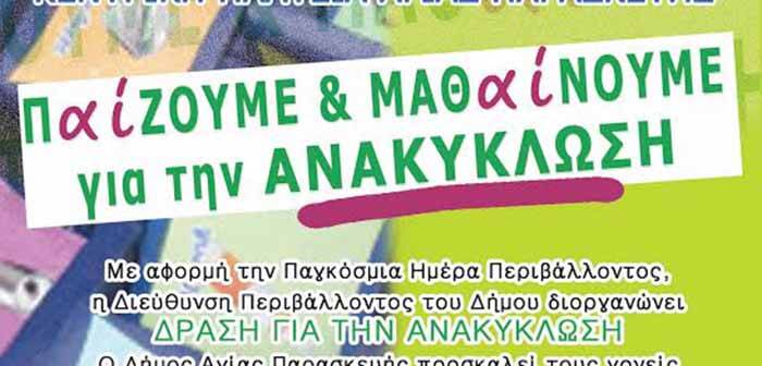 Το Σάββατο 6 Ιουνίου, στην Κεντρική πλατεία Αγίας Παρασκευής, ολοκληρώνεται η ΜΕΓΑΛΗ ΓΙΟΡΤΗ ΑΝΑΚΥΚΛΩΣΗΣ για τους μαθητές και τις μαθήτριες της πόλης και πραγματοποιείται η δράση ΠΑΙΖΟΥΜΕ ΚΑΙ ΜΑΘΑΙΝΟΥΜΕ ΓΙΑ ΤΗΝ ΑΝΑΚΥΚΛΩΣΗ. Συγκεκριμένα: