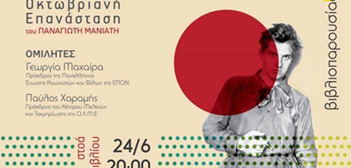 Την Τετάρτη 24 Ιούνη 2015, στις 20:00, στη Στοά του Βιβλίου, θα γίνει η παρουσίαση του βιβλίου του Παναγιώτη Μανιάτη, «Η ΠΟΙΗΣΗ ΣΤΗΝ ΟΚΤΩΒΡΙΑΝΗ ΕΠΑΝΑΣΤΑΣΗ». Για το βιβλίο θα μιλήσουν οι: