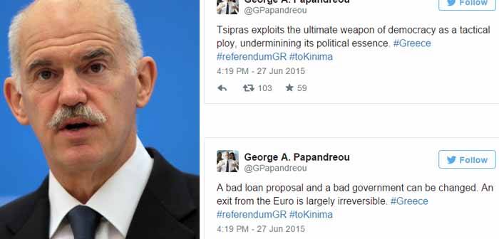 Μέσω twitter σχολίασε ο Πρόεδρος του Κινήματος Δημοκρατών Σοσιαλιστών, Γιώργος Παπανδρέου την απόφαση της κυβέρνησης για διεξαγωγή δημοψηφίσματος.