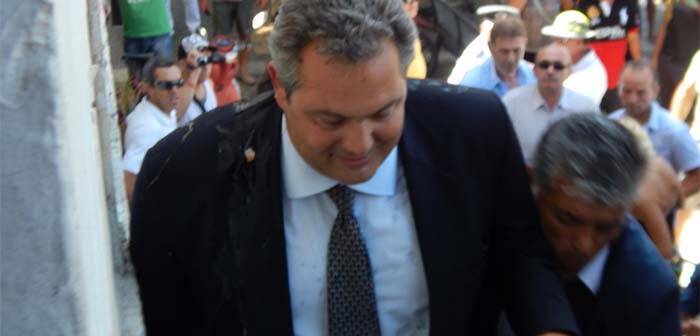 Με λερωμένο το σακάκι, ο Πάνος Καμμένος έτρεχε να γλιτώσει από τους κατοίκους, που έβγαιναν από κάθε σοκάκι του νησιού, για να του εκφράσουν την αγανάκτησή τους.