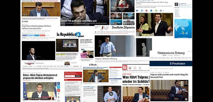 «Ελλάδα: ο Τσίπρας παραιτείται και καλεί σε εκλογές. Πρώτες βοήθειες από τον ESM», είναι ο τίτλος της La Republica, ενώ η ισπανική El Pais σημειώνει τα λόγια το Αλέξη Τσίπρα: «Οι Έλληνες θα αποφασίσουν».