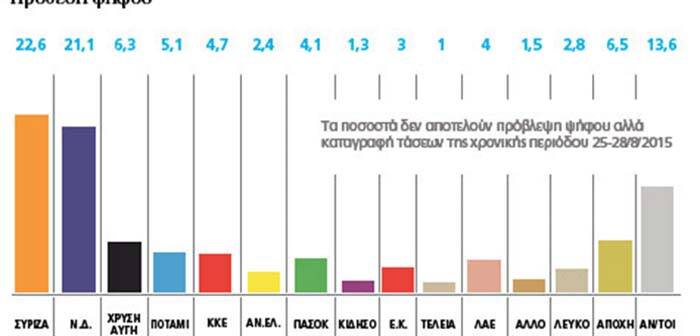 ΣΥΡΙΖΑ: 27,3% Νέα Δημοκρατία: 24,2% Χρυσή Αυγή 6,8% Το Ποτάμι 5,5% ΚΚΕ 5% ΠΑΣΟΚ 4,3% ΛΑΕ 4,8% Ένωση Κεντρώων 3,3% ΑΝΕΛ 3% |
