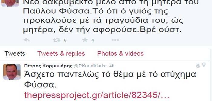 Στο Πειθαρχικό Συμβούλιο παραπέμπεται τελικά ο υπάλληλος της Γενικής Γραμματείας Ενημέρωσης και Επικοινωνίας Πέτρος Κορμικιάρης ο οποίος εξαπέλυσε ανήθικη επίθεση στην μητέρα του Παύλου Φύσσα, μέσω Twitter.