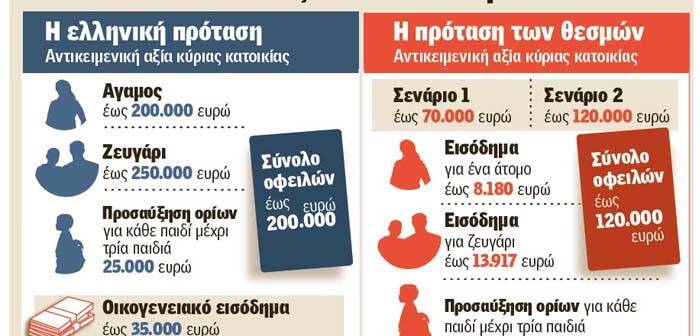 Οι σκληρές προτάσεις των δανειστών αφορούν μόνο τα νοικοκυριά που βρίσκονται κάτω από τα όρια της φτώχειας, ενώ ένα από τα σενάριά τους που επαναφέρουν τεχνηέντως για να ασκήσουν πίεση στην ελληνική πλευρά -αυτό της προστασίας κύριας κατοικίας με αντικειμενική αξία έως τα 70.000 ευρώ- καλύπτει μόλις το 20% των ιδιοκτητών.