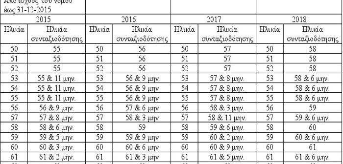 Τα όρια ηλικίας συνταξιοδότησης λόγω γήρατος των ασφαλισμένων των φορέων κοινωνικής ασφάλισης, δηλαδή όλα τα Ταμεία του ιδιωτικού τομέα, συμπεριλαμβανομένης της Τράπεζας της Ελλάδος, που μέχρι την έναρξη ισχύος του ν. 4336/2015 δεν έχουν θεμελιώσει δικαίωμα πλήρους ή μειωμένης σύνταξης λόγω γήρατος, αυξάνονται σταδιακά έως την 1.1.2022 σύμφωνα με τους πίνακες 1 και 2 της περίπτωσης 6, της υποπαραγράφου Ε3, της παραγράφου Ε, του άρθρου 2 του ν. 4336/2015 και διαμορφώνονται σε έτη και μήνες ως εξής :