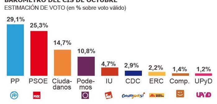 Σύμφωνα, με την εκτίμηση ψήφου σε δημοσκόπηση που διεξήγαγε το Κοινωνιολογικό Κέντρο Ερευνών (CIS), το Λαϊκό Κόμμα (ΡΡ) του Μαριάνο Ραχόι έρχεται πρώτο με ποσοστό 29,1%, μακριά ωστόσο από την δυνατότητα σχηματισμού αυτοδύναμης κυβέρνησης. Έπονται οι Σοσιαλιστές (PSOE) του Πέδρο Σάντσεθ με 25,3%. Οι Podemos, του Πάμπλο Ιγκλέσιας με ποσοστό 10,8% έρχονται τέταρτοι. Το κόμμα-έκπληξη που θα αποτελέσει ρόλο ρυθμιστή, αν επιβεβαιωθούν οι μετρήσεις, είναι οι Ciudadanos με 14,7%, τετραπλασιάζοντας την δύναμή τους.