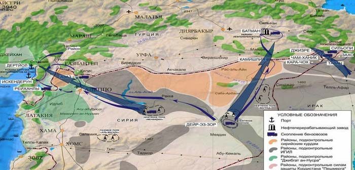 Το υπουργείο άμυνας έδωσε στη δημοσιότητα έναν χάρτη που δείχνει τους δύο βασικούς δρόμους μέσω των οποίων το πετρέλαιο διοχετεύεται στην πόλη Μπατμάν, όπου βρίσκονται μεγάλες μονάδες διύλισης και στα λιμάνια της Αλεξανδρέτας και το Ντορτιόλ, στις ακτές της Μεσογείου.