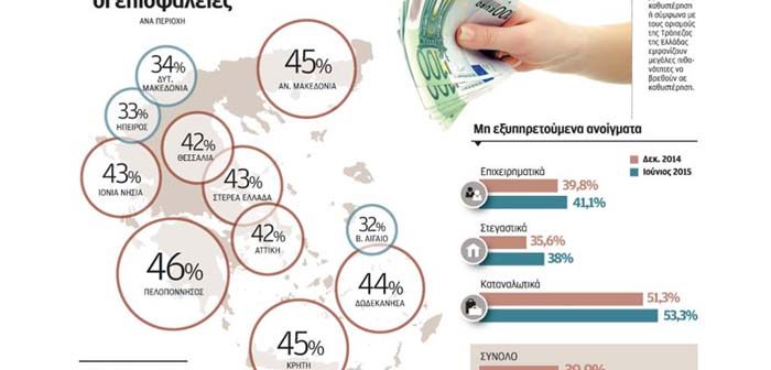 Στην αντίπερα όχθη, το χαμηλότερο ποσοστό σε μη εξυπηρετούμενα δάνεια –κοντά στο 35%– εμφανίζουν περιοχές όπως η Ήπειρος, τα νησιά του Βορείου Αιγαίου και η Δυτική Μακεδονία, παρότι πρόκειται για τις πιο φτωχές περιοχές της χώρας που έχουν υποστεί μεγάλη μείωση εισοδημάτων λόγω της κρίσης. Οι παράδοξες αυτές αποκλίσεις μπορούν να αποδοθούν σε στρατηγικούς κακοπληρωτές, δηλαδή σε άτομα που, εκμεταλλευόμενα τη νομική αναποτελεσματικότητα, είδαν την κρίση ως ευκαιρία για να αποφύγουν την αποπληρωμή των υποχρεώσεών τους στις τράπεζες, στα χαλαρά κριτήρια με τα οποία οι τράπεζες έδιναν δάνεια τις ημέρες της ευφορίας, αλλά και στο γεγονός ότι οι πιο πλούσιες περιοχές υπερτίμησαν τις πραγματικές οικονομικές τους δυνατότητες και διαμόρφωσαν ένα επίπεδο ζωής που δεν μπορούσαν να υποστηρίξουν.