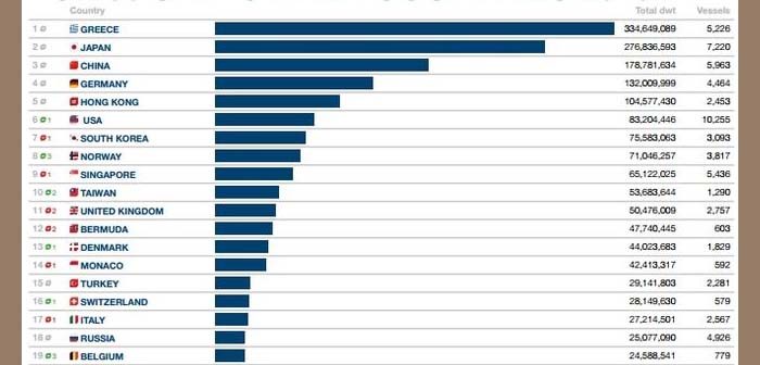 Σύμφωνα, με την ετήσια επετηρίδα «Lloyd’s List Top 100 2015», η ελληνική ναυτιλία ελέγχει 334,649 εκατ. τόνους dwt χωρητικότητας 60 εκατ. Δεύτερη έρχεται η Ιαπωνία και ακολουθεί η Κίνα.