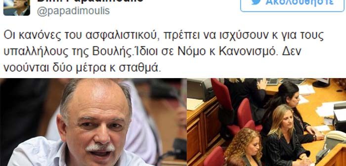Με ένα αιχμηρό tweet, ο ευρωβουλευτής του ΣΥΡΙΖΑ Δημήτρης Παπαδημούλης τονίζει ότι οι κανόνες του ασφαλιστικού, πρέπει να ισχύσουν και για τους υπαλλήλους της Βουλής.
