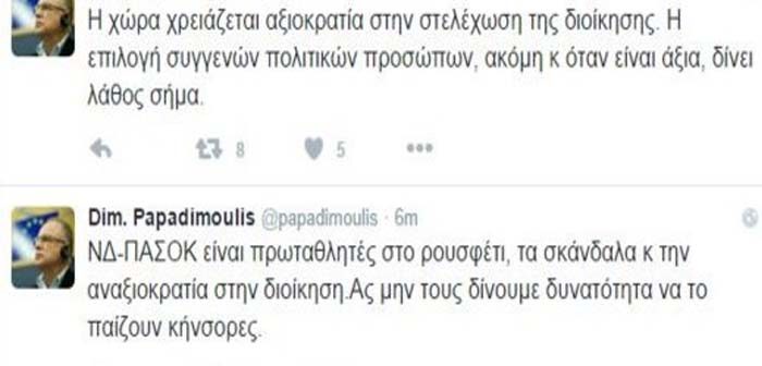 Ενδεικτική η ανάρτηση του Δημήτρη Παπαδημούλη στον προσωπικό του λογαριασμό στο Twitter με την οποία καυτηριάζει την τακτική αυτή χαρακτηρίζοντας «λάθος σήμα» την επιλογή συγγενών πολιτικών πρόσωπων «ακόμη και όταν είναι άξια».
