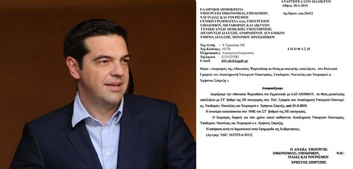 Σύμφωνα με πληροφορίες, πρόκειται για τη σύζυγο του Γιώργου Τσίπρα, Αθανασία Ψαρουδάκη, η οποία διορίστηκε ως μετακλητή υπάλληλος στο γραφείο του υπουργού Υποδομών Χρήστου Σπίρτζη.