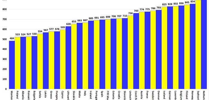 Στον αντίποδα, βρίσκονται το Μαυροβούνιο, η Πολωνία και η Αλβανία (484, 523 και 524 βαθμοί αντίστοιχα). Η Ελλάδα βρίσκεται πολύ πιο πίσω από τις άλλες χώρες του ευρωπαϊκού Νότου όπως η Ισπανία (19η θέση με 695 βαθμούς), η Πορτογαλία (20ή θέση και 691 βαθμοί) και η Ιταλία (22η θέση με 667 βαθμούς), αλλά και η γειτονική FYROM που κατατάσσεται 18η σε σύνολο 35 χωρών με 699 βαθμούς.