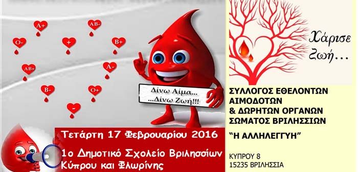 Ο Σύλλογος Εθελοντών Αιμοδοτών & Δωρητών Οργάνων Σώματος Βριλησσίων “Η ΑΛΛΗΛΕΓΓΥΗ” οργανώνει την Τετάρτη 17 Φεβρουαρίου 2016 εθελοντική αιμοδοσία στο 1ο Δημοτικό Σχολείο Βριλησσίων (Κύπρου και Φλωρίνης) από 17:00 έως 20:00