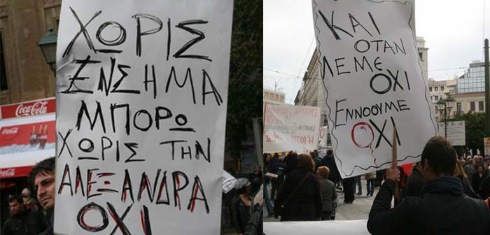 Στο συλλαλητήριο της Αθήνας κατά του ασφαλιστικού είδαμε το πλακάτ που παρουσιάζουμε στη φωτογραφία και μας έκανε μεγάλη εντύπωση. Στην αρχή δεν μπορούσαμε να καταλάβουμε γιατί ότι ο συγκεκριμένος νεαρός μπορεί αν ζήσει χωρίς ένσημα αλλά δεν μπορεί χωρίς την Αλεξάνδρα, ενώ στο πίσω μέρος έγραφε «Όταν λέμε ΟΧΙ εννοούμε ΟΧΙ» . Το ψάξαμε και να τι βρήκαμε.