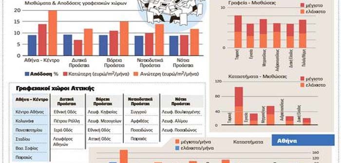 Οι γραφειακοί χώροι ήταν ανέκαθεν το αγαπημένο προϊόν των επενδυτών (περίπου 50% των συνολικών επενδύσεων διεθνώς γίνονται σε γραφειακούς χώρους). Στην Ελλάδα οι αποδόσεις κινούνται στα ελκυστικά επίπεδα του 8%-8,5%.