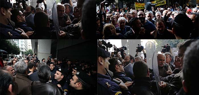 Ωστόσο ενημερώθηκαν πως τον μόνο που θα μπορούσαν να δουν ήταν ο διευθυντής του γραφείου του. Αυτό ήταν και η αφορμή για να ξεσπάσουν συγκρούσεις. Τα μέλη της ΠΟΕΔΗΝ επιχείρησαν να «σπάσουν» τον κλοιό των ΜΑΤ και να μπουν στο κτίριο, ενώ άρχισαν να χτυπούν τις κατεβασμένες πόρτες, με τους άνδρες των ΜΑΤ να τους απωθούν και να κάνουν χρήση χημικών.