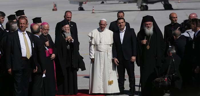 Τον Πάπα υποδέχτηκε στη Λέσβο ο Οικουμενικός Πατριάρχης Βαρθολομαίος και ο Αρχιεπίσκοπος Αθηνών και πάσης Ελλάδος Ιερώνυμος καθώς και ο Πρωθυπουργός Αλέξης Τσίπρας και ο και οι τρεις προκαθήμενοι μαζί και ο πρωθυπουργός μετέβησαν στον καταυλισμό μεταναστών της Μόριας