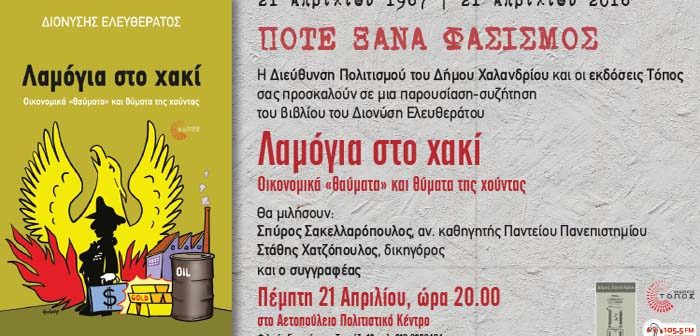 Η Διεύθυνση Πολιτισμού του Δήμου Χαλανδρίου και οι εκδόσεις Τόπος προσκαλούν σε μια παρουσίαση – συζήτηση του βιβλίου του Διονύση Ελευθεράτου «Λαμόγια στο χακί: Οικονομικά “θαύματα” και θύματα της χούντας», την Πέμπτη 21 Απριλίου 2016 και ώρα 20:00 στο Αετοπούλειο Πολιτιστικό Κέντρο (Φιλικής Εταιρείας & Τομπάζη 18, Χαλάνδρι, τηλ. 210-6820464).