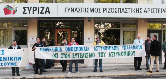Υπενθυμίζεται ότι νωρίς το πρωί του Σαββάτου, μέλη της Πανελλήνιας Ομοσπονδίας Αστυνομικών Υπαλλήλων έκαναν κατάληψη στα κεντρικά γραφεία του ΣΥΡΙΖΑ, στην πλατεία Κουμουνδούρου και ανάρτησαν πανό, διαμαρτυρόμενοι για το ασφαλιστικό.