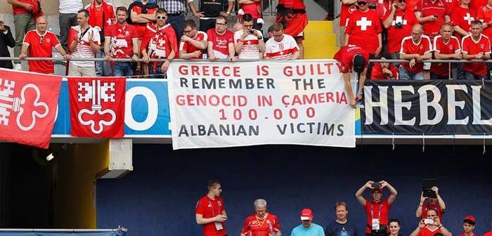 Σύμφωνα με τα όσα απαθανάτισαν οι κάμερες, μία ομάδα φιλάθλων που καθόταν στις εξέδρες όπου βρίσκονται οι Αλβανοί φίλαθλοι ανήρτησε πανό στα αγγλικά με τη φράση: “Η Ελλάδα είναι ένοχη. Θυμηθείτε τη γενοκτονία της Τσαμουριάς. Εκατό χιλιάδες Αλβανοί θύματα“.