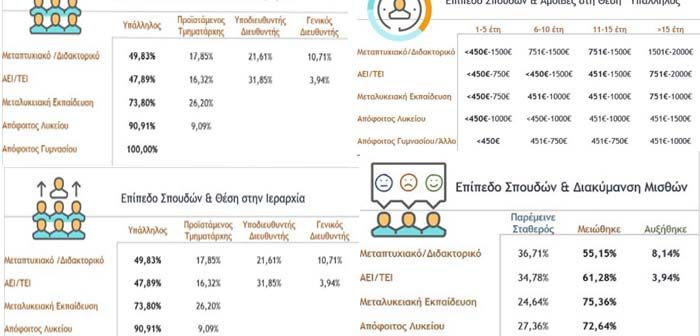 Η έρευνα εξέτασε το επίπεδο σπουδών των συμμετεχόντων σε σχέση με τη θέση τους στην Ιεραρχία της επιχείρησης που εργάζονται σήμερα, καθώς και τις μηνιαίες αμοιβές που απολαμβάνουν ανάλογα με το επίπεδο σπουδών τους. Τα μεγαλύτερα ποσοστά σε κάθε επίπεδο σπουδών είναι σήμερα υπάλληλοι. Στις ανώτατες θέσεις της ιεραρχίας από Υποδιευθυντές και πάνω συναντάμε μόνο Πτυχιούχους ΑΕΙ/ΤΕΙ, μεταπτυχιακούς και διδακτορικούς.
