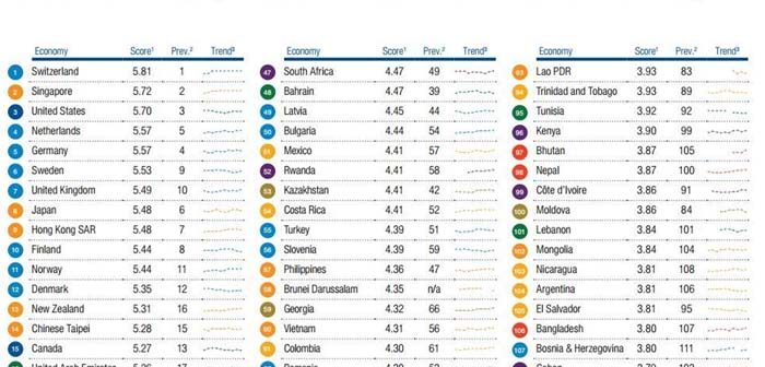 Την πρώτη πεντάδα συμπληρώνουν η Σιγκαπούρη, οι ΗΠΑ, η Ολλανδία και η Γερμανία, που έχασε μία θέση από την τέταρτη στην οποία είχε εδραιωθεί τα τελευταία χρόνια. Η Ελλάδα φιγουράρει στην 86η θέση της λίστας αφήνοντας πίσω της την Αλγερία, την Ονδούρα, την Καμπότζη και την Σερβία. Την ίδια ώρα, βρίσκεται πίσω από την Ουκρανία, τη Ναμίμπια, την Κύπρο και το Μαυροβούνιο.