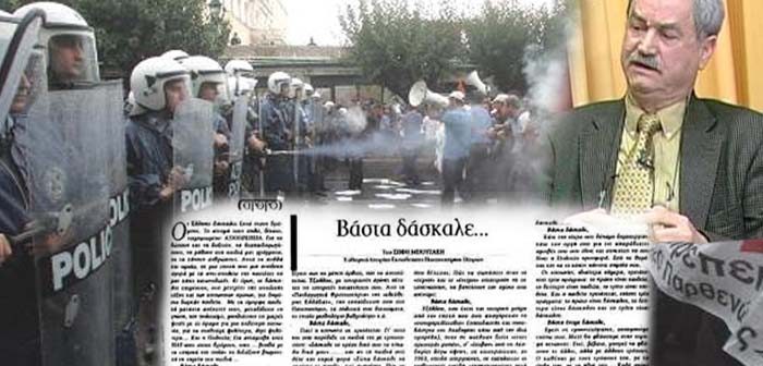 «Οι Έλληνες δάσκαλοι ξανά στους δρόμους. Το αίτημά τους απλό, δίκαιο, τεκμηριωμένο: ΑΞΙΟΠΡΕΠΕΙΑ. Για να δώσουν και να δοθούν, να διαπαιδαγωγήσουν, να μάθουν στα παιδιά μας γράμματα, να τα κάνουν ανθρώπους. αυτά τα πολλά και ωραία, σε μια εποχή που μια ασύδοτη αγορά με τα αντι-σχολεία της πασχίζει να μας κάνει καταναλωτές. Κι όμως, οι δάσκαλοι επιμένουν, στο μετερίζι της σχολικής τάξης και των κοινωνικών αγώνων, για δημόσια δωρεάν παιδεία. Με τα όμορφα παιδικά ματάκια απέναντί τους, μεταδίδουν τη γνώση, τον πολιτισμό, μπολιάζουν τις μικρές ψυχές με το όραμα για μια καλύτερη κοινωνία, για να σταθούμε ψηλότερα, λίγο ψηλότερα… Kαι η Πολιτεία; Για ανταμοιβή τους ΜΑΤ-ώνει στους δρόμους, τους… Βοηθά με τα «χημικά της όπλα» να διδάξουν βιωματικά τη χημεία στα παιδιά…