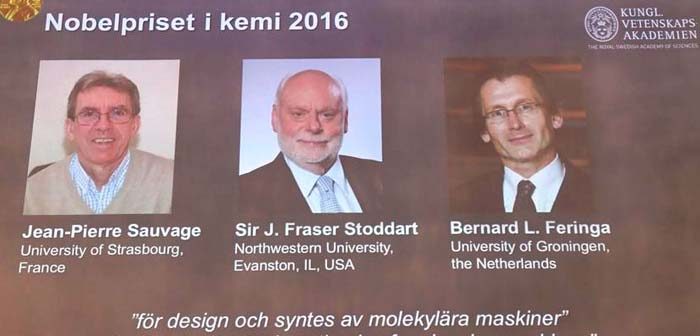 Ο Γάλλος Ζαν-Πιερ Σοβάζ (Jean-Pierre Sauvage), ο Βρετανός Ζ. Φρέιζερ Στόνταρτ (J. Fraser Stoddart) και ο Ολλανδός Μπέρναρντ Λ. Φερίνγκα (Bernard L. Feringa) βραβεύονται με το Νόμπελ Χημείας 2016 για τη δουλειά τους στον σχεδιασμό και τη σύνθεση μικροσκοπικών «μοριακών συσκευών» ή νανοσυσκευών, ανακοίνωσε σήμερα η Βασιλική Σουηδική Ακαδημία Επιστημών.