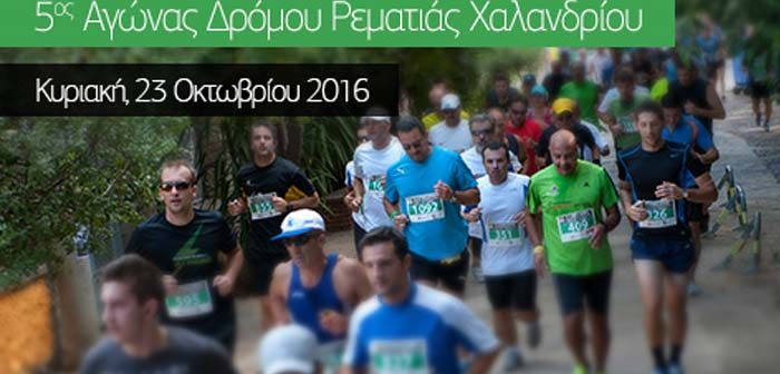 O Δήμος Χαλανδρίου διοργανώνει την Κυριακή 23 Οκτωβρίου 2016 τον 5ο Αγώνα Δρόμου Ρεματιάς Χαλανδρίου με εκκίνηση και τερματισμό την κεντρική πλατεία Χαλανδρίου (πλατεία Ελευθερωτών-Αγ. Νικολάου) .