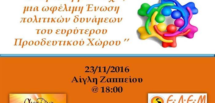 Οι συνεργαζόμενοι φορείς κοινωνικής βάσης ΑΚΤΙΔΑ (όμιλος κοινωνικού, πολιτικού και επιστημονικού προβληματισμού) και Ε.Δ.Ε.Μ. (Ένωση Δημοκρατικής Εθνικής Μεταρρύθμισης) συνδιοργανώνουν δημόσια εκδήλωση διαλόγου και συνεννόησης κομμάτων, κινήσεων και προσωπικοτήτων του ευρύτερου χώρου των σύγχρονων σοσιαλιστών, προοδευτικών φιλελεύθερων και ριζοσπαστών δημοκρατών.