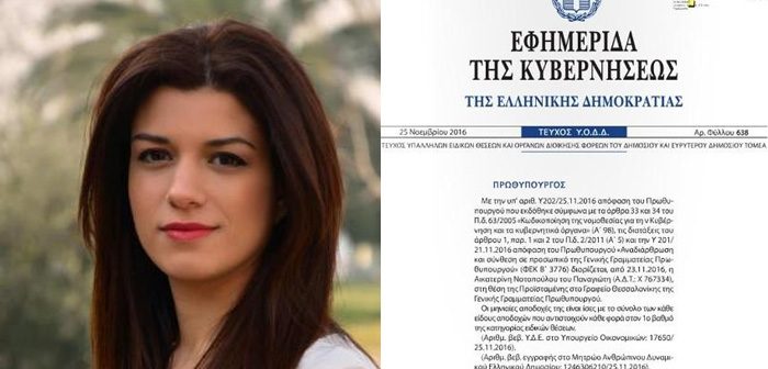 Δημοσιεύτηκε στο ΦΕΚ ο διορισμός της διευθύντριας, του γραφείου του πρωθυπουργού στην Θεσσαλονίκη Κατερίνας Νοτοπούλου, μετά και τα εγκαίνιά του το περασμένο Σάββατο.