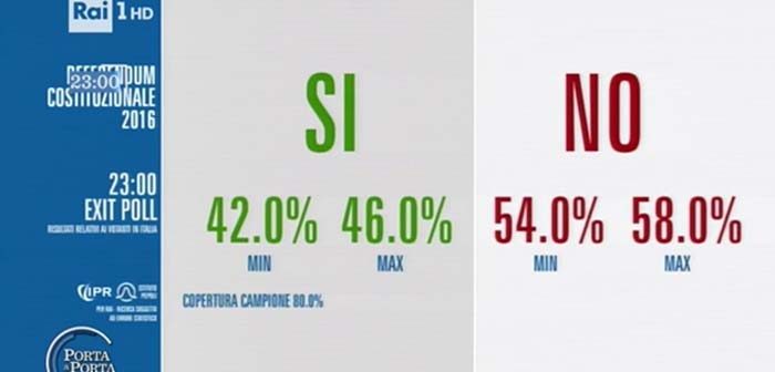 Σύμφωνα με το πρώτο exit poll που μετέδωσε η ιταλική κρατική τηλεόραση Rai, το «ναι» συγκεντρώνει από 42% έως 46% ενώ το «όχι» 54% έως 58%.