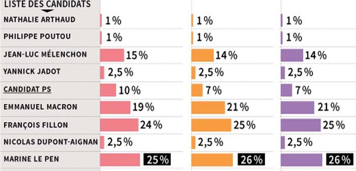 Η Λεπέν φαίνεται να κερδίζει στήριξη που κυμαίνεται μεταξύ 25 και 26% έναντι 23 με 25% για τον Ρεπουμπλικανό υποψήφιο Φρανσουά Φιγιόν, σύμφωνα με δημοσκόπηση της Ipsos Sopra Steria για λογαριασμό των Cevipof και Le Monde.
