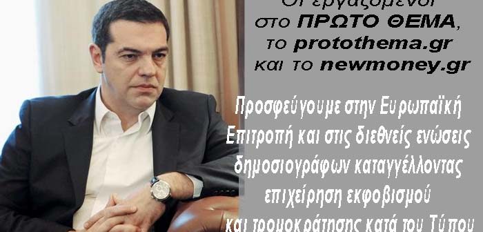 Εμείς οι εργαζόμενοι στο ΠΡΩΤΟ ΘΕΜΑ, το protothema.gr και το newmoney.gr, αφού συζητήσαμε, με τη συμμετοχή και αντιπροσωπείας της ΕΣΗΕΑ, για τις συστηματικές επιθέσεις που δέχεται η εφημερίδα μας και το site, από τον ίδιο τον πρωθυπουργό της χώρας και τη συμπεριφορά που επιδεικνύουν, πάγια πλέον, κυβερνητικά στελέχη, και λαμβάνοντας υπόψη και τη συνολική τακτική που ακολουθεί η κυβέρνηση έναντι του Τύπου, καταλήξαμε στα εξής:
