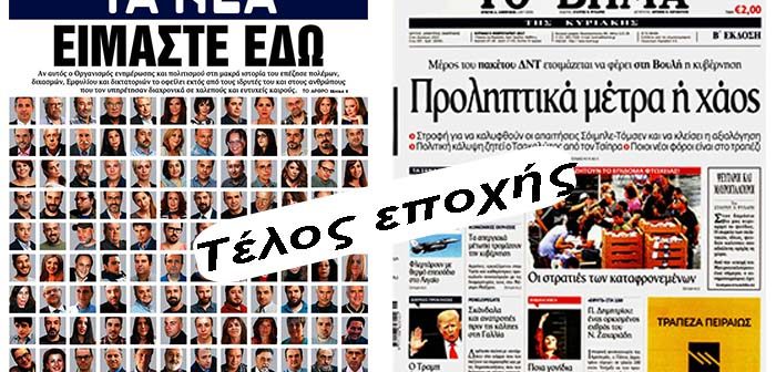 Τέλος εποχής και όχι μόνο της μεταπολίτευσης. Συνηθίσαμε τους μικρούς θανάτους αυτού που συκοφαντείται ως κατεστημένο και κάποιοι σήμερα μπορεί μέχρι και να χαίρονται για τον θάνατο δύο εφημερίδων που ήταν η ζωντανή ιστορία του τόπου. Δεν έχουν σημασία αυτοί οι χαιρέκακοι. Δεν ήταν αναγνώστες. Πιθανότατα ανήκουν στην συνομοταξία εκείνων που μεγάλωσαν με τον Πασκάλ και τον Μπρικνέρ κι έμαθαν να μισούν οποιαδήποτε ιδέα δεν έγινε σύνθημα στα καφενεία της μεταπολίτευσης.