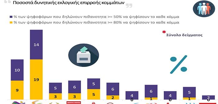 Στο ερώτημα «Πόσο πιθανό θα ήταν να ψηφίσετε το παρακάτω κόμμα, αν γίνονταν εκλογές την επόμενη Κυριακή; Χρησιμοποιήστε την κλίμακα «0- 10», όπου το «0» αντιστοιχεί στη μηδενική πιθανότητα να το ψηφίσετε και το «10» αντιστοιχεί στη βεβαιότητα.» έχουμε: