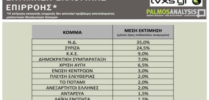 Ισχυρό προβάδισμα της ΝΔ έναντι του ΣΥΡΙΖΑ καταγράφει και η  δημοσκόπηση της Palmos Analysis με τη διαφορά  στην εκλογική επιρροή να είναι στις 10,5% μονάδες με την απροσδιόριστη ψήφο να ξεπερνά το 42%. Η διαφορά στην πρόθεση ψήφου η διαφορά φτάνει τις 13 μονάδες.