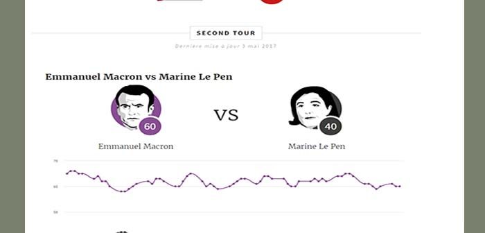 Ο κεντρώος υποψήφιος για την προεδρία της Γαλλίας Εμανουέλ Μακρόν φέρεται να προηγείται με 60% στην πρόθεση ψήφου έναντι 40% για την ακροδεξιά αντίπαλό του Μαρίν Λεπέν ενόψει του δεύτερου γύρου των εκλογών, σύμφωνα με δημοσκόπηση της Opinionway — ίδιο ποσοστό με αυτό που έδινε η εταιρεία χθες.