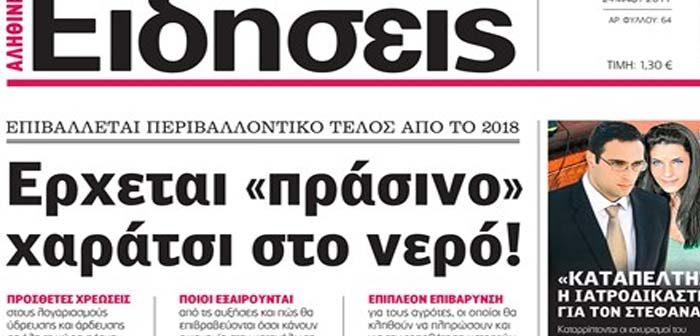 Για ένα ακόμη «χαράτσι», περιβαλλοντικού τέλους στο νερό, κάνει λόγο η εφημερίδα «ΗΜΕΡΗΣΙΑ» και όπως τονίζει με αυτό θα επιβαρυνθούν τα νοικοκυριά σε όλη τη χώρα αφού θα επιβληθεί από όλες τις εταιρείες ύδρευσης (ΕΥΔΑΠ, ΕΥΑΘ κ.λπ) και θα συνδέεται με την κατανάλωση του νερού. Απ’ αυτό όμως οι μεγαλύτεροι χαμένοι όμως θα είναι οι αγρότες και κυρίως όσοι έχουν στην κατοχή τους μεγάλες καλλιέργειες.