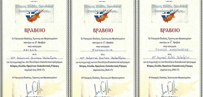 Συγκεκριμένα οι τάξεις Γ’ και Δ1’ του συγκεκριμένου Σχολείου συμμετείχαν στον Πανελλήνιο Εκπαιδευτικό πρόγραμμα – διαγωνισμός «Κύπρος, Ελλάδα, Ομογένεια – Εκπαιδευτικές Γέφυρες (2016-2017)», το οποίο διοργανώθηκε από το Υπουργείο Παιδείας, Έρευνας και Θρησκευμάτων και τελέστηκε υπό την αιγίδα της Α.Ε. του Προέδρου της Κυπριακής Δημοκρατίας κ. Ν. Αναστασιάδη, όπου και έλαβαν τα παρακάτω 3 βραβεία: