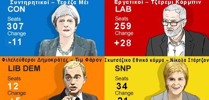 Με μια πρώτη ματιά διαπιστώνουμε ότι η Μέι δεν κατακτά την απόλυτη πλειοψηφία των εδρών και έτσι είναι εξαιρετικά δύσκολος ο σχηματισμός κυβέρνησης στη Μεγάλη Βρετανία.