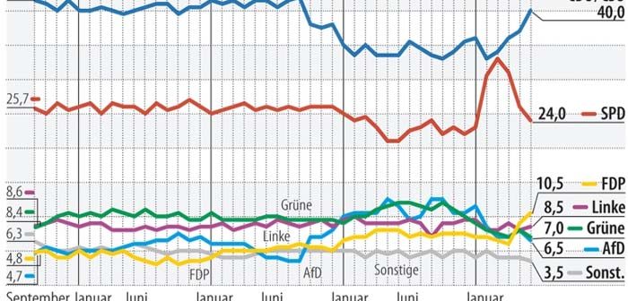 Σαρώνει η Μέρκελ στη Γερμανία. Νέα δημοσκόπηση δείχνει να απογειώνονται τα ποσοστά των Χριστιανοδημοκρατών. Αυτό κυρίως οφείλεται στο γεγονός ότι η προσφυγική κρίση δεν βρίσκεται πλέον στην πρώτη γραμμή της επικαιρότητας, με αποτέλεσμα να μην επηρεάζει τους Χριστιανοδημοκράτες, που κυβερνούν, αλλά να έχει άμεσο αντίκτυπο στους εθνολαϊκιστές του AfD που καταγράφει χαμηλό διετίας.