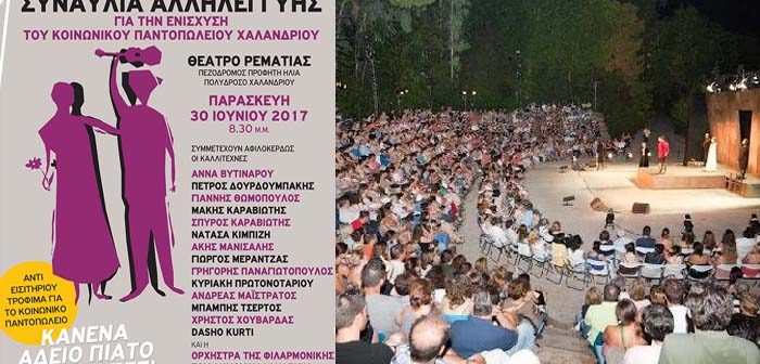 Με τίτλο «Κανένα πιάτο άδειο στο τραπέζι» θα γίνει και πάλι φέτος μεγάλη συναυλία αλληλεγγύης για την ενίσχυση του Κοινωνικού Παντοπωλείου του Δήμου Χαλανδρίου, την Παρασκευή 30 Ιουνίου στο Ευριπίδειο Θέατρο της Ρεματιάς. Όπως αποδεικνύεται και από την περσινή εμπειρία, η συναυλία αποτελεί ένα κοινωνικό γεγονός ενότητας και συμπόρευσης ανθρώπων από διαφορετικές κατευθύνσεις που τους συνδέει η ευαισθησία για την ανάγκη του συνανθρώπου.