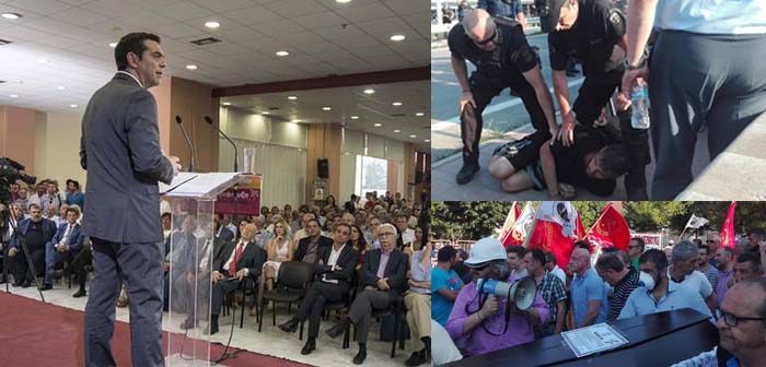 Και ενώ ο πρωθυπουργός βρισκόταν μέσα στο εκθεσιακό κέντρο, διαδηλωτές κυρίως εργαζόμενοι στη ΔΕΗ, οικοδόμοι και συνταξιούχοι άρχισαν να προσεγγίζουν το χώρο. Διαδηλωτές συνδικαλιστές της ΔΕΗ κρατούσαν ένα φέρετρο προκειμένου να εκφράσουν συμβολικά την διαμαρτυρία τους για τις εξελίξεις στη ΔΕΗ.