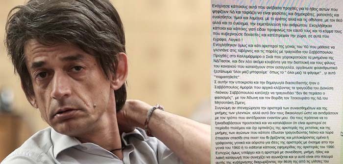 «Ενόχλησε κάποιους αυτό που ανέβασα προχθές για το ήθος αυτών που ψηφίζουν ΝΔ και ταιριάζει να είναι φασίστες και δημοκράτες, ρατσιστές και ευαίσθητοι, τίμιοι και λαμόγια, με το κράτος αλλά και τις offshore, με τον θεό αλλά και το έγκλημα, την εκμετάλλευση του ανθρώπου. Ενοχλήθηκαν κάποιοι και κάποιες γιατί είδαν προφανώς τον εαυτό τους και το κόμμα τους που κυβερνούσε δεκαετίες και κατέστρεψαν την χώρα, σε αυτά που έγραφα. Λογικό !