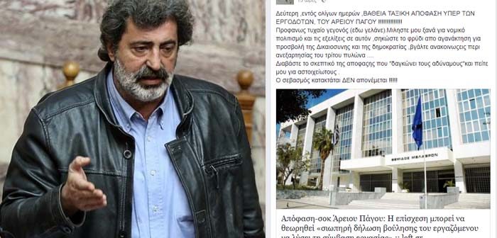 Αυτή τη φορά, ο αναπληρωτής υπουργός Υγείας τα έβαλε με τον Άρειο Πάγο. Στην ανάρτησή του, με αφορμή δημοσίευμα του left.gr, το οποίο παραθέτει, με τίτλο «Απόφαση-σοκ του Αρείου Πάγου: Η επίσχεση μπορεί να θεωρηθεί “σιωπηρή δήλωση βούλησης του εργαζόμενου να λύσει τη σύμβαση εργασίας”», σχολιάζει ότι οι δικαστές έλαβαν απόφαση υπέρ των εργοδοτών.