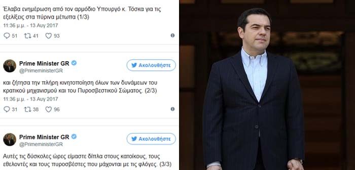 Παρά το γεγονός ότι έχουν καεί σπίτια, περιουσίες και τεράστιες εκτάσεις δάσους, ενώ κινδύνεψαν και ανθρώπινες ζωές σε Κάλαμο, Βαρνάβα και Καπανδρίτι, ο πρωθυπουργός της χώρας Αλέξης Τσίπρας αρκέστηκε μόνο σε τρία μηνύματα στο λογαριασμό του στο twitter χθες βράδυ: «Έλαβα ενημέρωση από τον αρμόδιο Υπουργό κ. Τόσκα για τις εξελίξεις στα πύρινα μέτωπα και ζήτησα την πλήρη κινητοποίηση όλων των δυνάμεων του κρατικού μηχανισμού και του Πυροσβεστικού Σώματος. Αυτές τις δύσκολες ώρες είμαστε δίπλα στους κατοίκους, τους εθελοντές και τους πυροσβέστες που μάχονται με τις φλόγες».