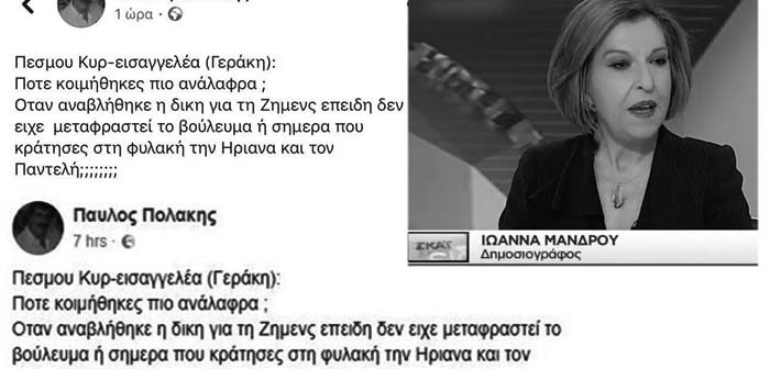 «Πεσμου Κυρ-εισαγγελέα (Γεράκη): Πότε κοιμήθηκες πιο ανάλαφρα; Όταν αναβλήθηκε η δίκη για τη Ζημενς επειδή δεν είχε μεταφραστεί το βούλευμα ή σήμερα που κράτησες στη φυλακή την Ηριάνα και τον Παντελή;;;;;;;;».