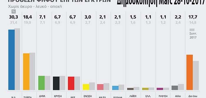 Στην έρευνα της εταιρείας Marc που δημοσιεύεται σήμερα, Σάββατο, στην εφημερίδα «Πρώτο Θέμα» η ΝΔ του Κυριάκου Μητσοτάκη συγκεντρώνει 30,3% έναντι μόλις 18,4% του ΣΥΡΙΖΑ.